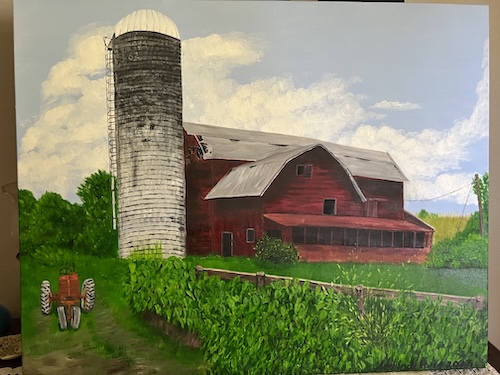 Red Barn with Blue Tractor